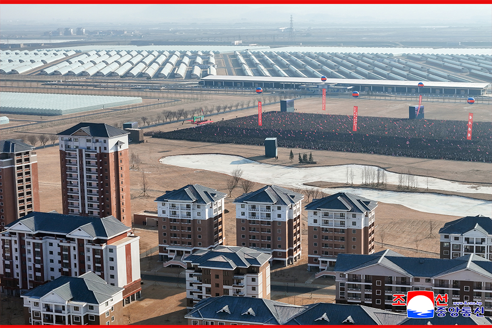 At the time when the absolute trust in and devoted loyalty to the WPK, organizer and guide of all victories of the Korean people, are permeating the whole country advancing towards the glorious Party Congress, an ideal farm town with an unprecedented group of large greenhouses has been erected on the bank of River Amnok in the northwestern part of the country to greet the great auspicious event of inauguration.