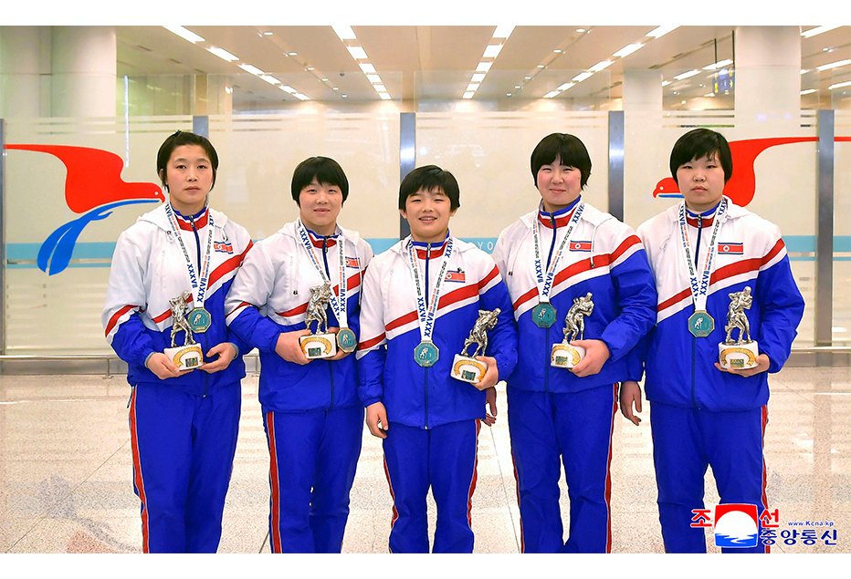 조국의 영예를 빛내이고 돌아온 레스링선수들을 4일 평양국제비행장에서 체육부문 일군들,체육인들,가족들이 뜨겁게 맞이하였다.