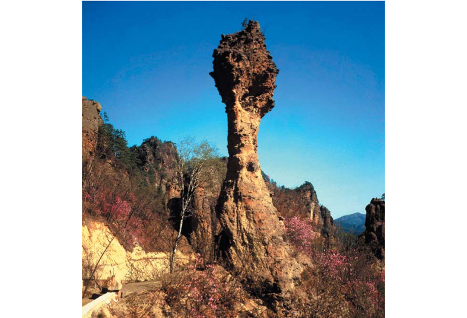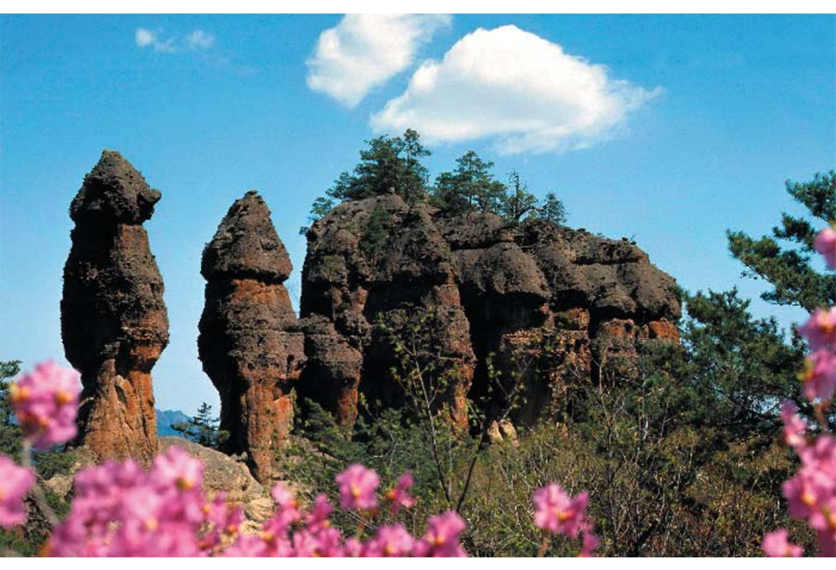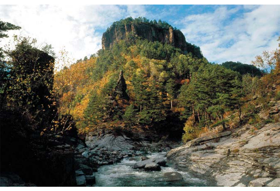 솟아오른 기묘한 봉우리들과 깎아지른듯한 절벽들,기암괴석들과 울창한 수림으로 뒤덮인 깊고깊은 골짜기들,독특한 여러가지 모양의 돌문,돌굴,협곡 등과 계곡마다에 형성된 크고작은 폭포들은 자연경치를 더욱 아름답게 하고있다.