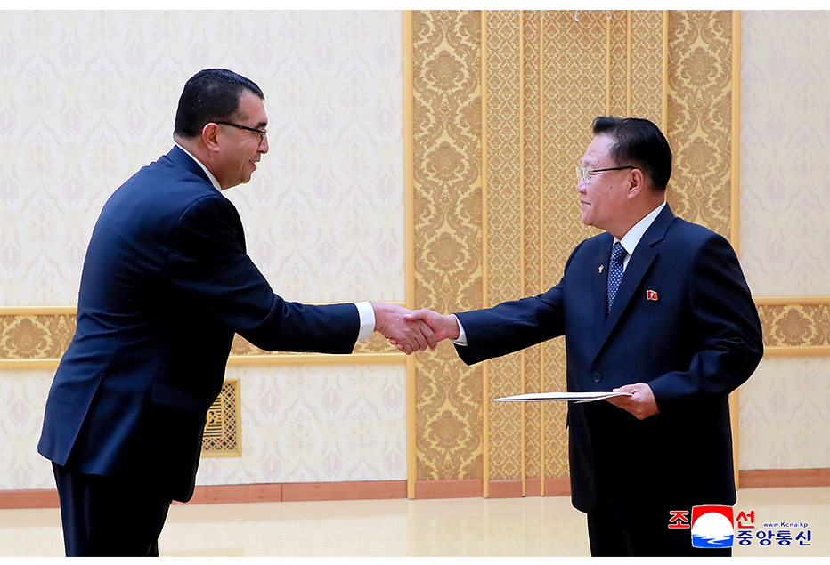 По поручению Председателя Государственных дел КНДР первый зампред Госсовета, председатель Президиума Верховного Народного Собрания (ВНС) Чвэ Рён Хэ 25 сентября в Мансудэском дворце съездов принял верительные грамоты у чрезвычайного и полномочного посла Государства Палестина Омара Джамаля Омара Пакиха.