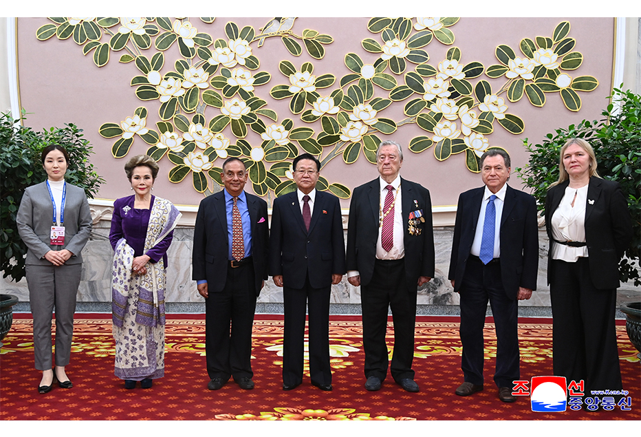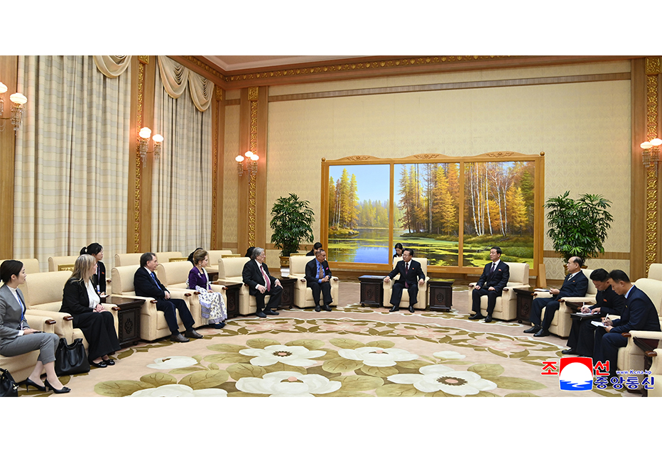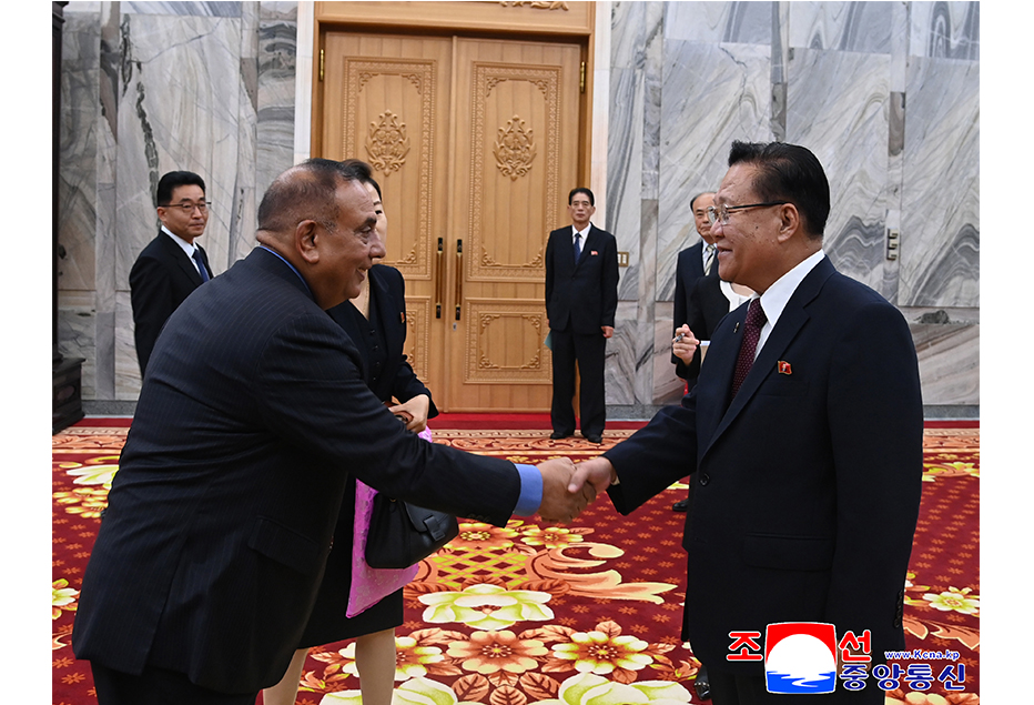 Choe Ryong Hae, member of the Presidium of the Political Bureau of the Central Committee of the Workers' Party of Korea, first vice-president of the State Affairs Commission of the DPRK and chairman of the Standing Committee of the Supreme People's Assembly, met and had a talk in a friendly atmosphere with Mukesh Sharma, secretary general of the International Kim Il Sung Prize Council and the International Kim Jong Il Prize Council, and its directors Alexandr Prokhanov, Dewi Soekarno and Matteo Carbonelli who paid a courtesy call on him at the Mansuedae Assembly Hall on October 11.