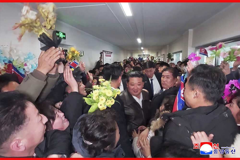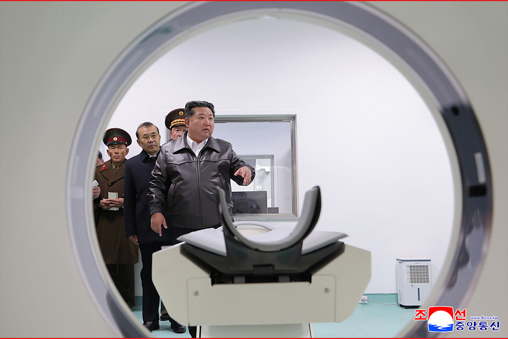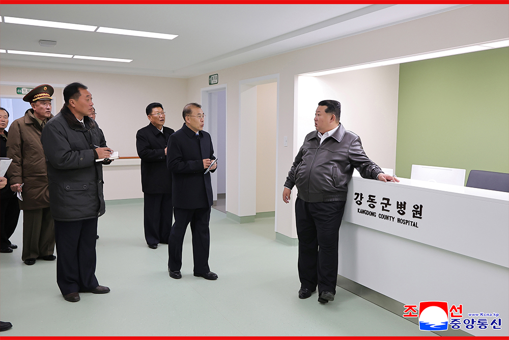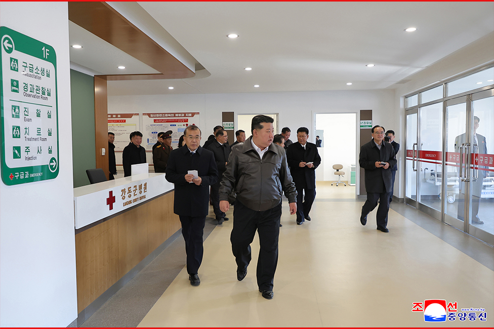 국무위원장이신 경애하는 김정은동지께서 당과 정부의 지도간부들과 함께 강동군병원에 도착하시였다.