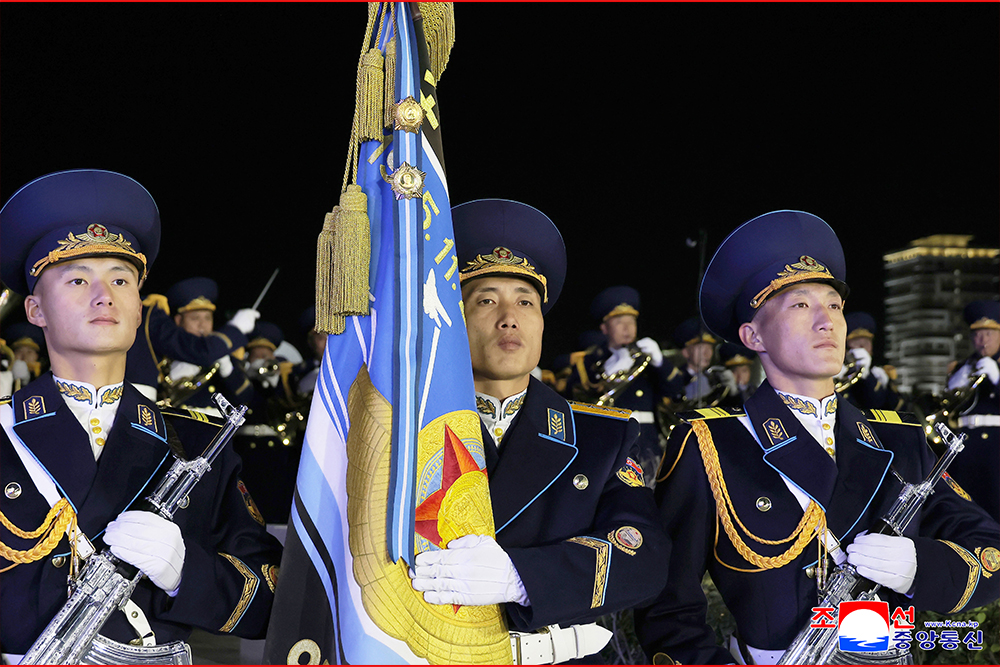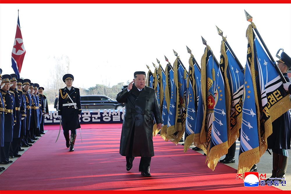 김정은동지께서는 전설적공훈으로 빛나는 조선인민군 공군과 관하부대 군기들에 전투적경례를 표하시고 공군명예위병대를 사열하시였다.