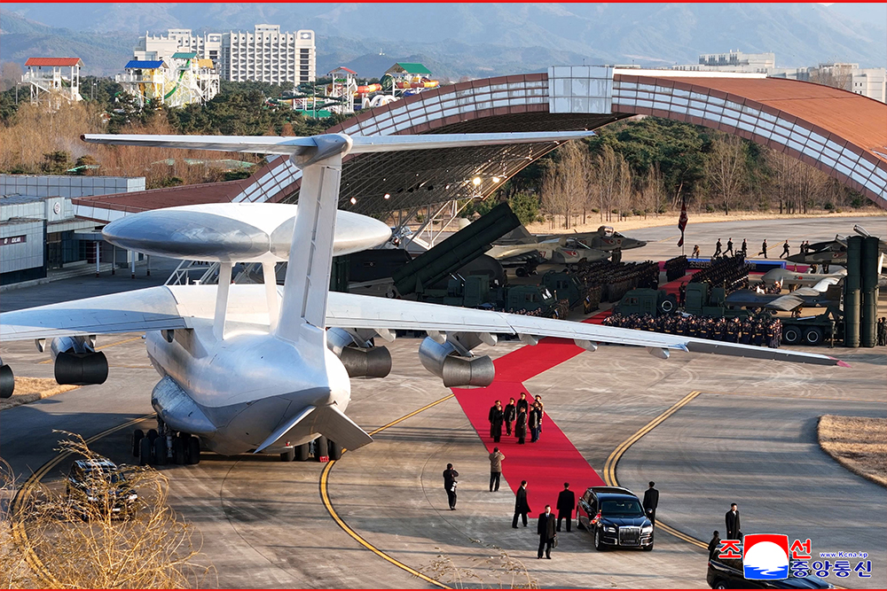 김정은동지께서 비행장에 도착하시자 전체 공군장병들은 탁월한 군건설사상과 비범한 군사적예지로 공화국무력발전의 일대 전성기를 열어주시고 오늘은 인민공군의 전투적행로에 길이 빛날 무상의 영광을 안겨주시는 백전백승의 강철의