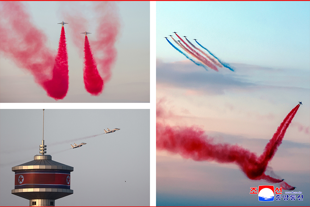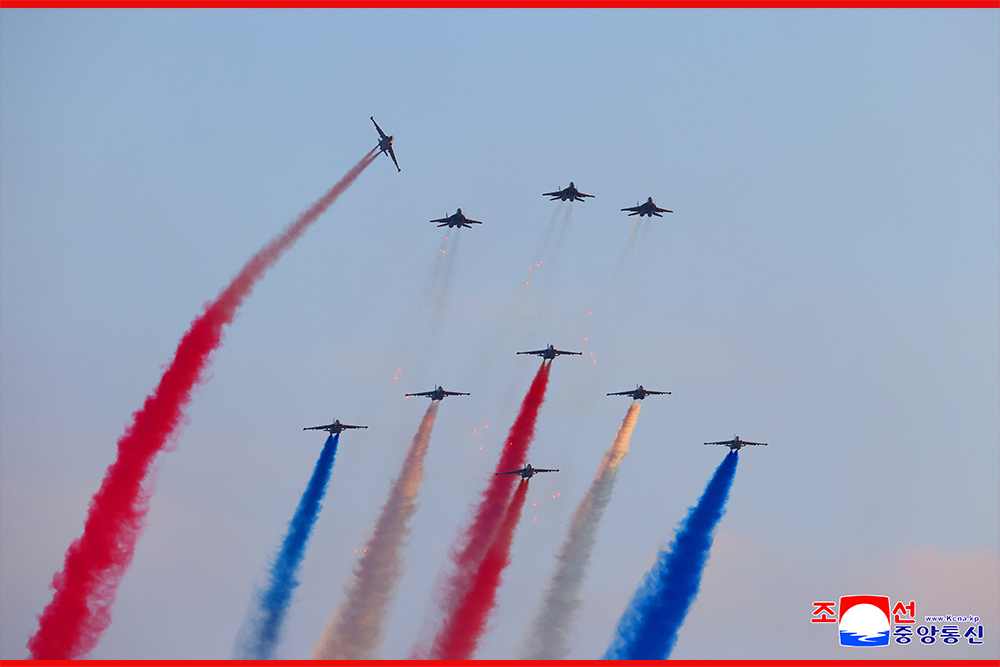 김정은동지를 모시고 시위비행을 하게 된 공군비행사들은 맑고 푸른 조국의 하늘에 아름다운 삼색비행운을 새기고 축포탄을 터쳐올리며 능란한 조종술을 남김없이 발휘하였다.