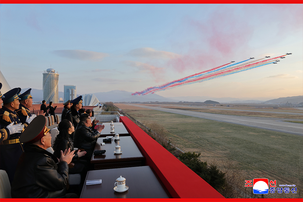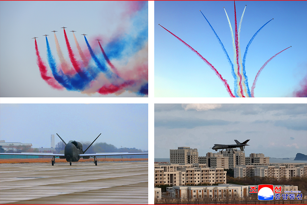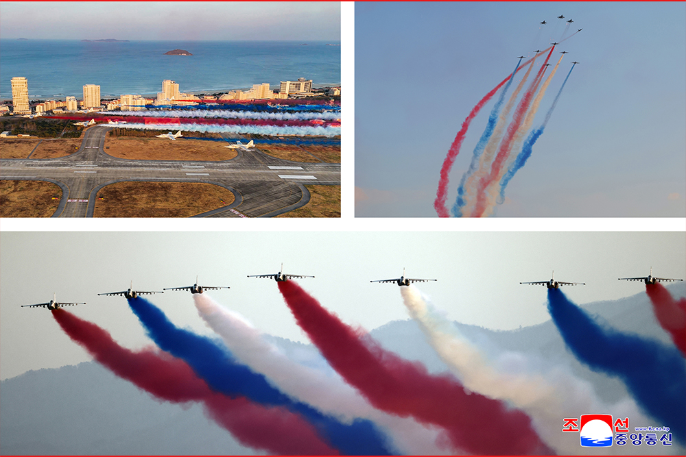 김정은동지께서는 격정의 환호를 터치는 공군장병들을 따뜻이 축하해주시면서 영용한 공군무력의 전체 비행사들과 지휘성원들,관병들이 영광의 군기에 새겨진 80년의 자랑스러운 연혁을 련속적인 승전신화로 빛내이며 우리 국가의 존엄과 인민의 행복을 굳건히 수호해나가리라는 확신을 표명하시였다.