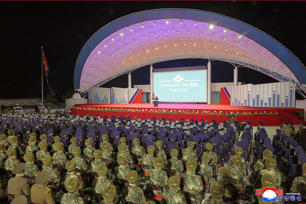 경애하는 김정은동지를 모시고 조선인민군 공군창설 80돐 기념보고회가 성대히 진행되였다.