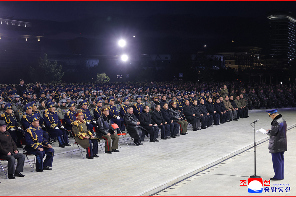 김정은동지를 위하여,사랑하는 조국의 미래를 위하여 청춘도 생명도 아낌없이 바쳐싸울 공군장병들의 억척불변의 맹세가 결사옹위의 우렁찬 함성으로 터져올라 11월의 하늘가로 끝없이 울려퍼지였다.