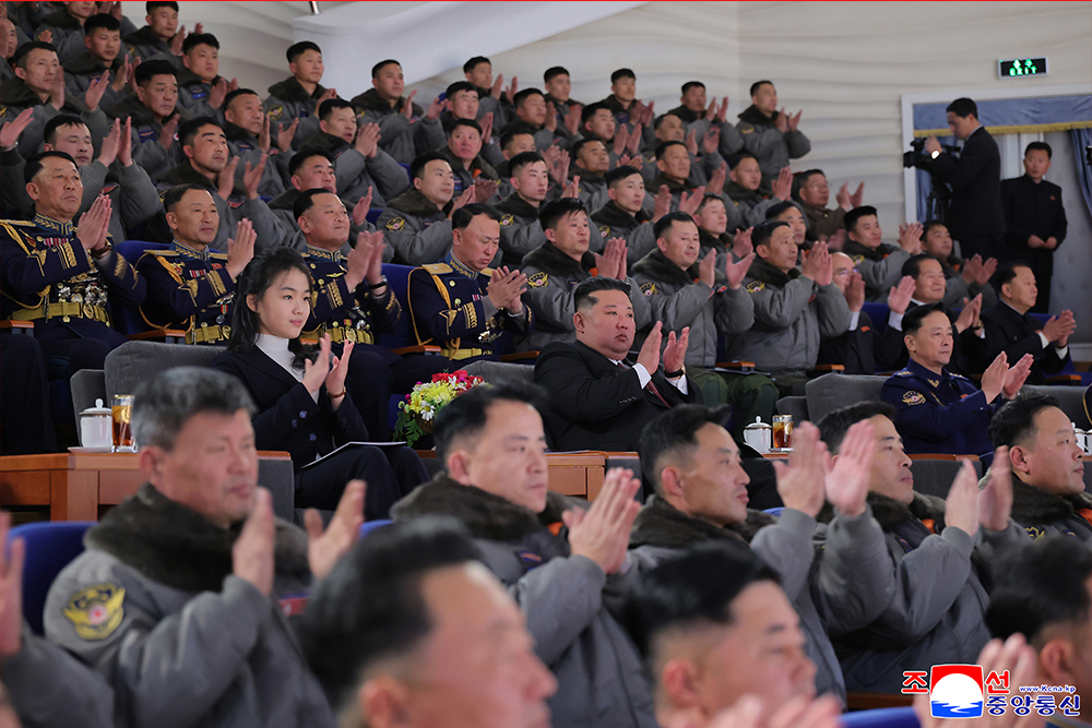 위대한 김정은공군의 불멸의 명함과 백승사를 무궁토록 빛내여갈 공군장병들의 철석의 의지를 힘있게 구가하는 혁명군가들의 장쾌한 뢰성은 장내를 세차게 격동시키였다.