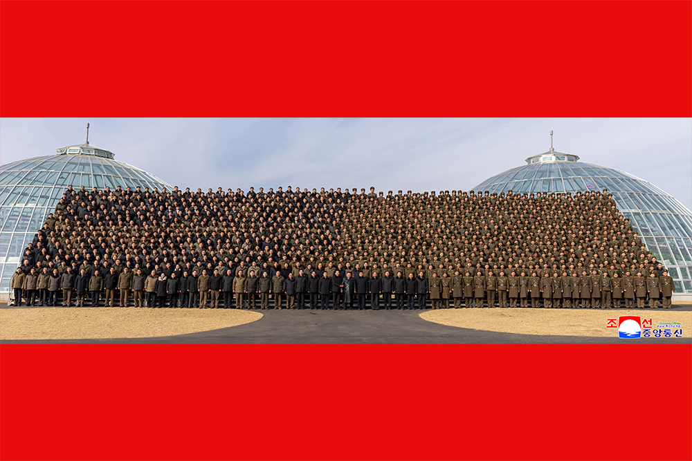 Ким Чен Ын встретился с учеными, техниками и руководящими работниками центрального и местного стройштабов, внесшими вклад в строительство Синичжуского тепличного комбината, и сфотографировался с ними на память.