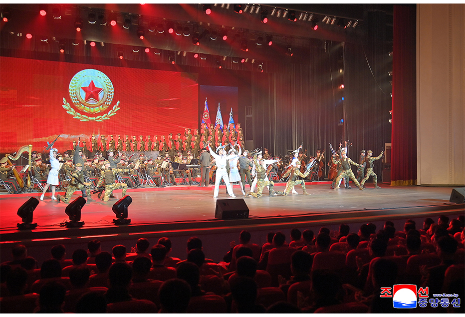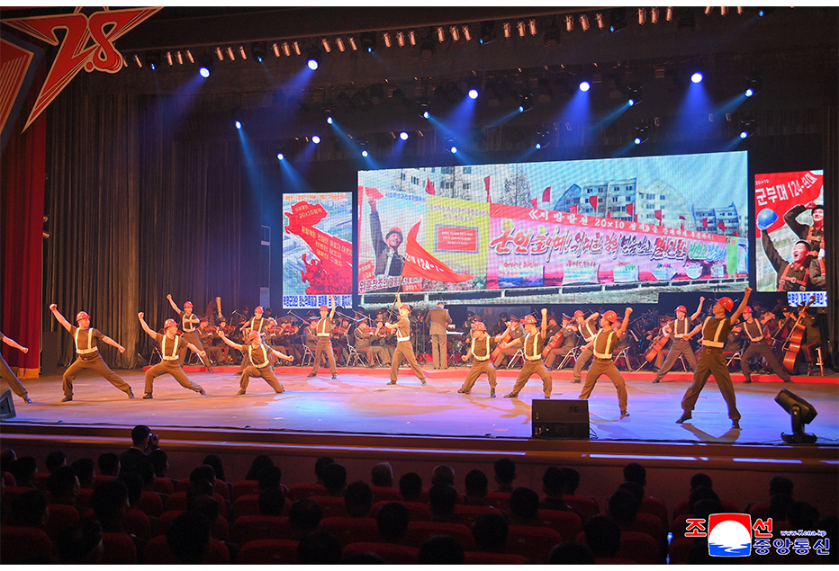 На сцене концерта, начатого мужским квинтетом и хором «Государственный гимн КНДР», представлены разнообразные номера, в том числе революционные военные песни, громко прозвучавшие на славном пути революционных вооруженных сил, и шедевры на тему патриотизма.