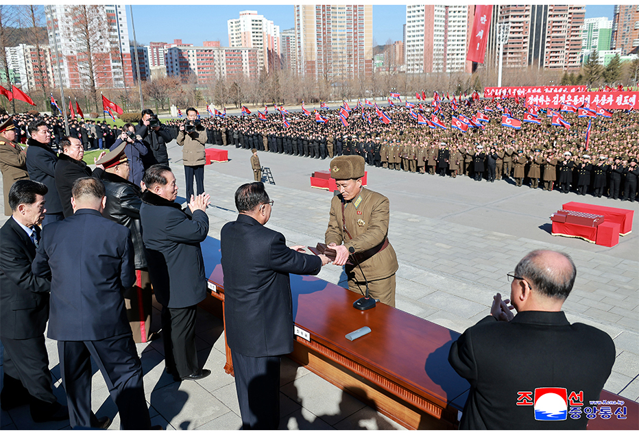新义州温室综合农场建设有功军人建设者和青年突击队员授勋仪式16日在平壤举行。