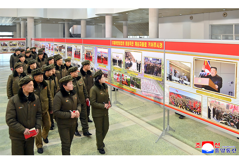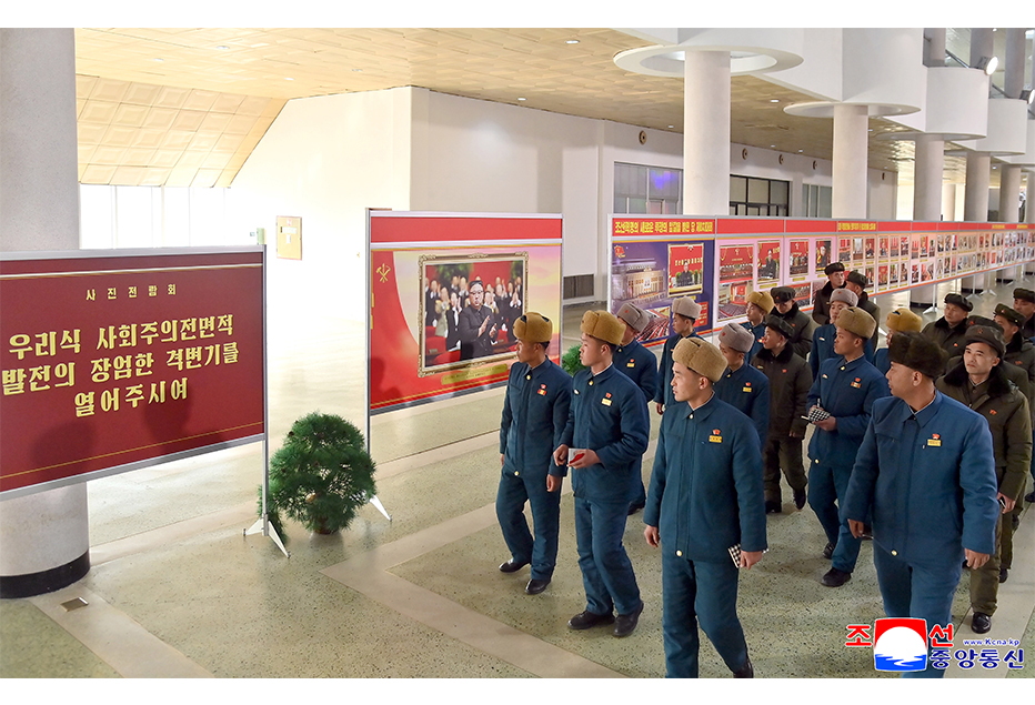 경애하는 김정은동지께서 당중앙위원회 제8기기간에 이룩하신 불멸의 업적을 보여주는 중앙사진전람회장에서 그들은 우리식 사회주의전면적발전의 새시대,인민의 꿈과 리상이 찬란한 현실로 꽃펴나는